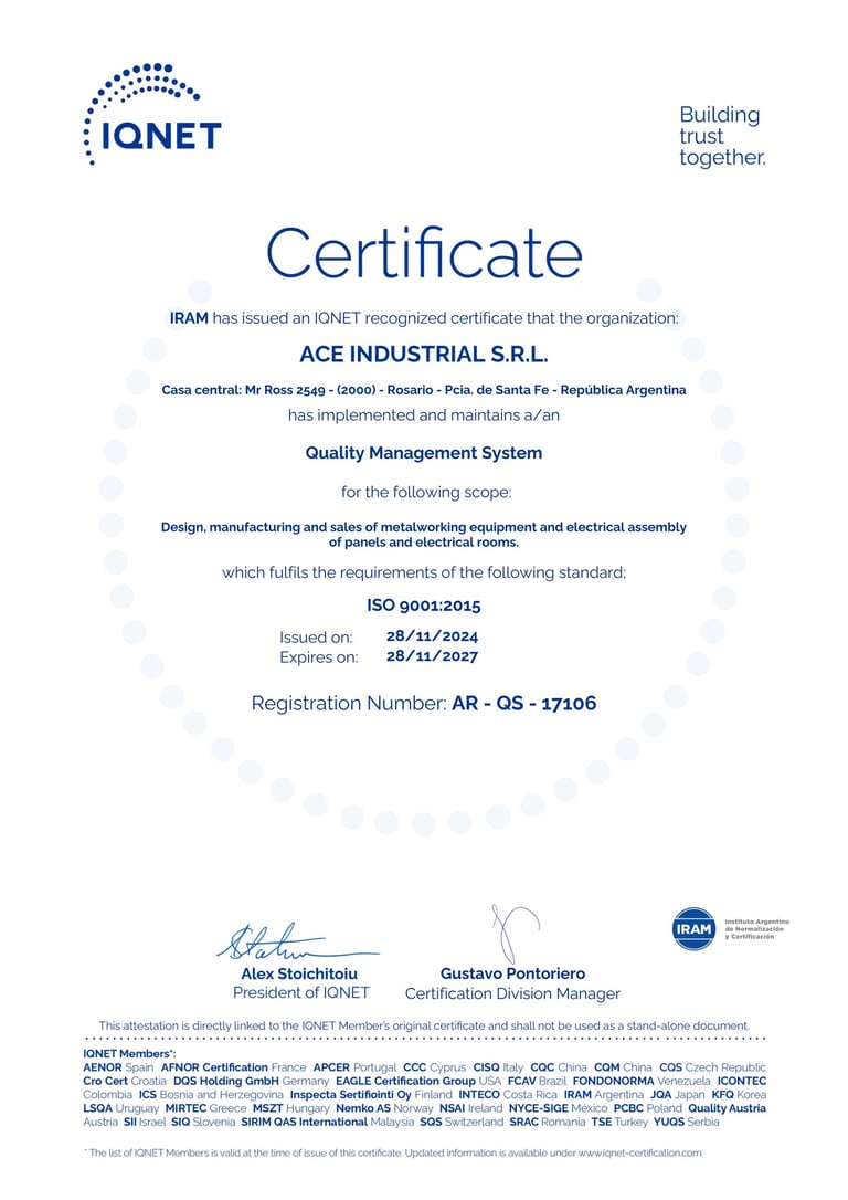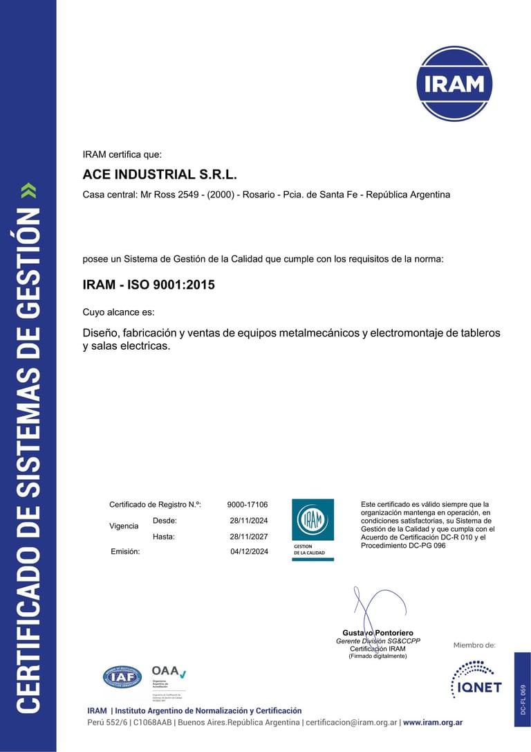 Ace Industrial ha alcanzado un nuevo hito en su compromiso con la calidad y excelencia al obtener la certificación ISO 9001:2015 en sus procesos de diseño, fabricación y ventas de equipos metalmecánicos, así como en el electromontaje de tableros y salas eléctricas. Esta certificación internacional, otorgada por cumplir con los más rigurosos estándares de calidad, reafirma la dedicación de Ace Industrial para ofrecer productos y servicios que cumplen con las expectativas y necesidades de sus clientes, optimizando sus procesos y asegurando la mejora continua en cada uno de ellos.